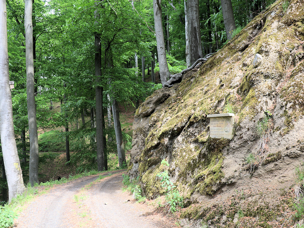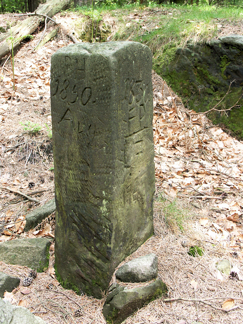 V zalesněném údolí Mezního potoka severozápadně pod kopcem ležel údajně ještě kolem roku 1920 asi 2 m dlouhý a 1 m široký oválný kámen, na němž byly vyryté šikmo nad sebou tři kříže a kolem nich množství rozmanitých znaků, písmen a letopočtů, z nichž nejstarší byly 1414, 1431 a 1441.