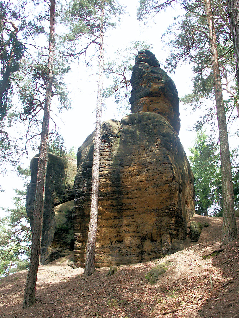 Západním směrem vybíhá ke Studenému protáhlý hřbet, na jehož temeni je asi 500 m od vrcholu několik pískovcových skal a jedna z nich, zvaná Kamzičí věž, se příležitotně využívala i k lezení. O 150 m dále hřbet šikmo protíná čedičová žíla s několika menšími skalkami, na jejímž severovýchodním konci je výraznější skalní suk, nazývaný Semenáček. U jihozápadního konce žíly je několik starých povrchových dobývek a na malé výšině tu stojí hraniční kámen s vyrytými iniciálami a letopočty 1830 a 1850, poničený novějšími rytinami z 60. let 20. století. Různé letopočty z 18. a 19. století najdeme i na některých skalkách v okolí.